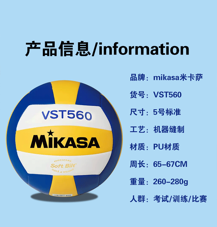 mikasa/米卡萨中考训练排球5号初中生软式硬排比赛五号VST560中学